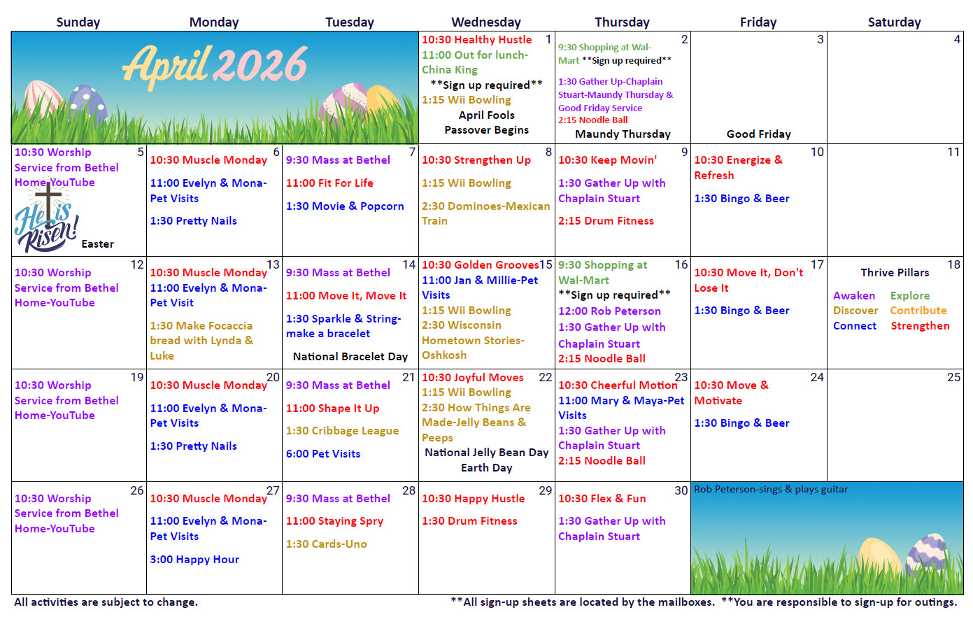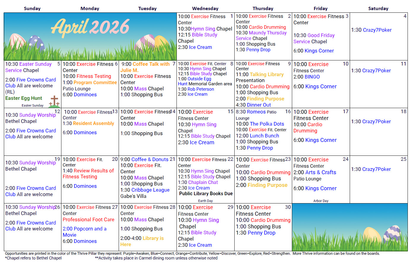 Events on our calendars align with one or more of our six color-coded pillars, easily identifiable on our calendars for a balanced, enriching experience.