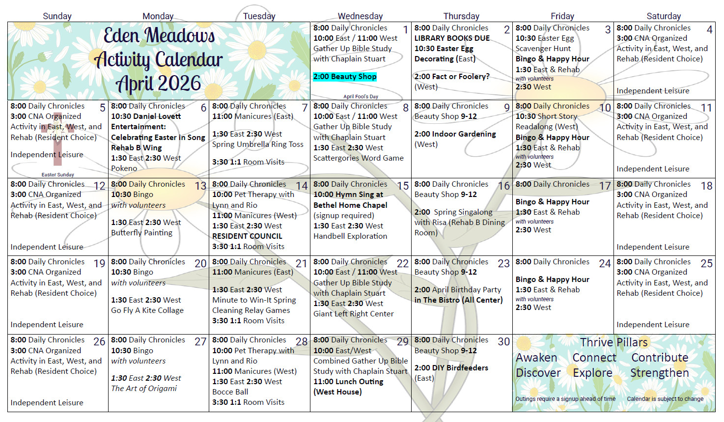 We believe every stage of life should be lived to the fullest. That’s why we’ve created Thrive, our campus wellness program, which is thoughtfully designed to enrich the mind, body, and spirit of our community members. It offers diverse experiences structured around six key pillars, fostering holistic well-being. Join us for a journey of discovery and growth. Let’s Thrive Together!